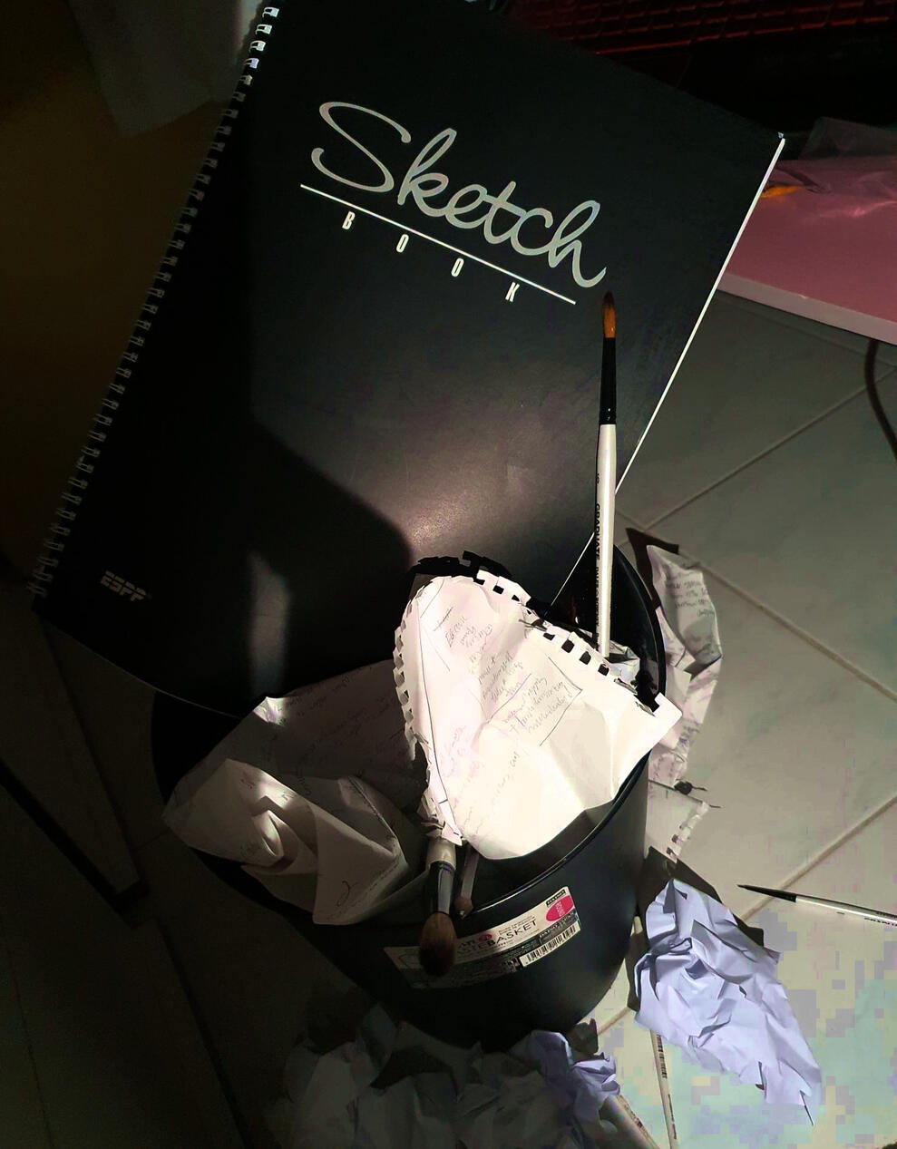 Photograph taken for Secondary 3 end of year examinations for Art.We had to choose a theme regarding 'binary opposites' to explore in this particular assessment. This was one of the still life photographs taken to explore the theme I had gone with, 'an Artist Vs a Viewer'.I wanted to explore the dichotomy between an Artist Vs a Viewer's perception. This photograph in particular, is about the 'Artist's perception'.As an artist, we can almost always pick out flaws from within our works and constantly criticize ourselves for it. Sometimes it leads to a loop of self criticism, and a feeling of being nothing more than a 'Garbage Maker'.